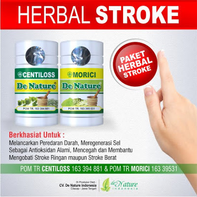 Salah satu Herbal untuk mengatasi penyakit stroke adalah produk dari De nature Indonesia Centilos dan Morici De nature, Centilos dan Morici paket herbal untuk penyakit stroke yang terbuat dari bahan alami dan aman di konsumsi karena terdaftar di BPOM
